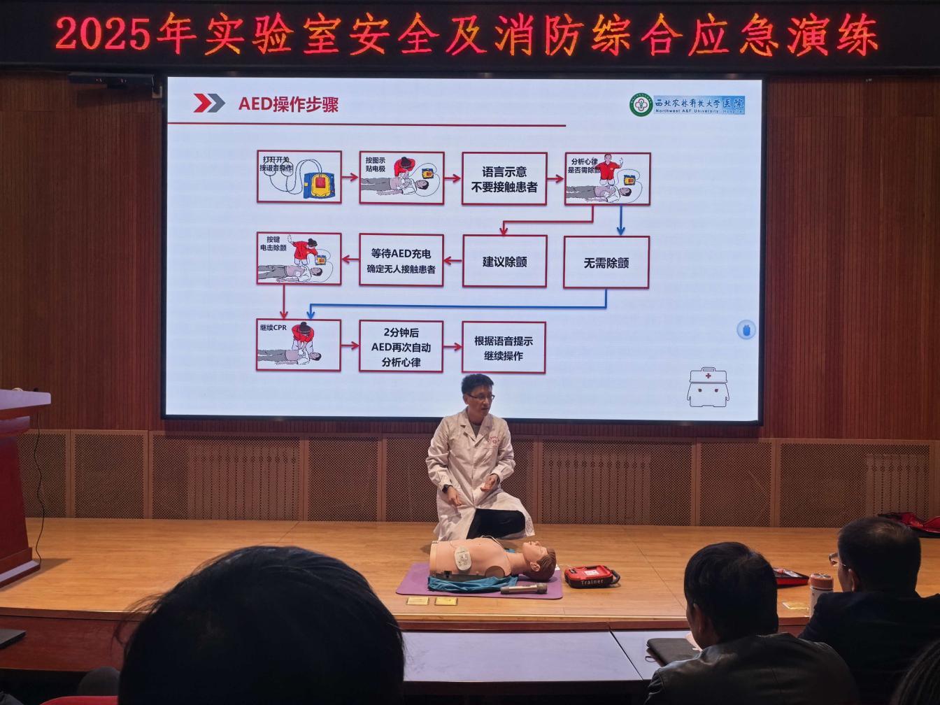 校医院薛闯医生则聚焦 AED 应急使用, 粘贴电极、心律分析、除颤操作等关键流程,让师生清晰掌握急救核心步骤。